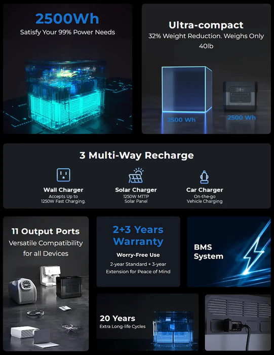 - Power and Capacity: 2,200W and 2,500Wh capacity for all your power needs.